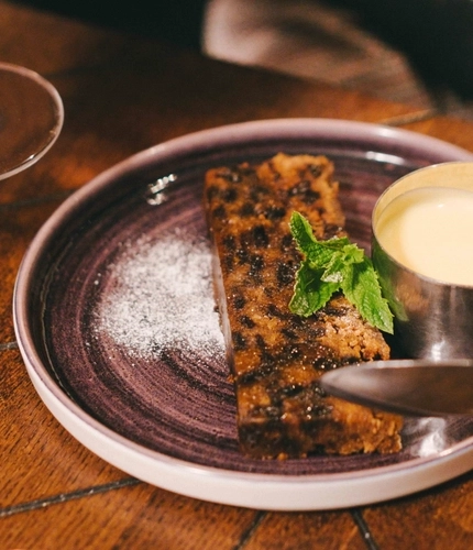 Served warm with chocolate sauce and a scoop of clotted cream ice cream (405 kcal/ 39.4g sugar/ 0.23g salt)