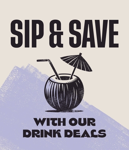A graphic promoting 'sip and save with our drinks deals.'