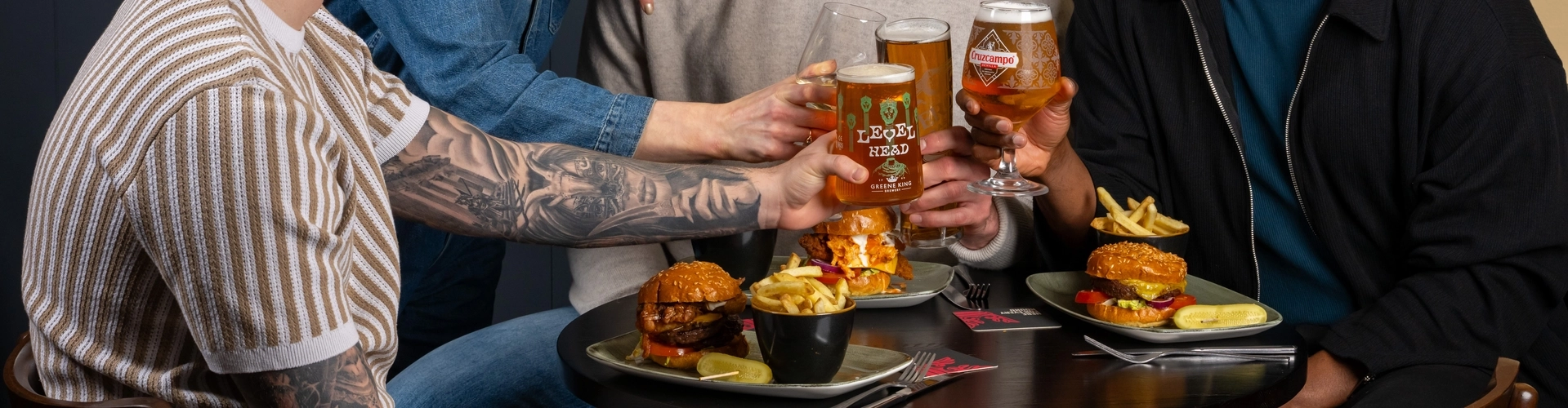 Four individuals sit around a table in a restaurant or pub setting. Three of them are seated, each holding a drink in a toast. The fourth individual stands beside the table, raising a wine glass. On the table are plates with burgers, bowls of fries, and small dipping containers.