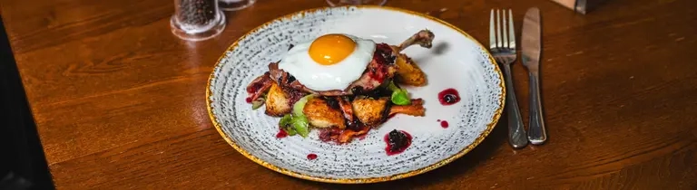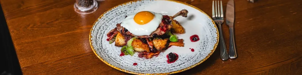 Plate of food set on the table with cutlery, menus and a glass of fizz
