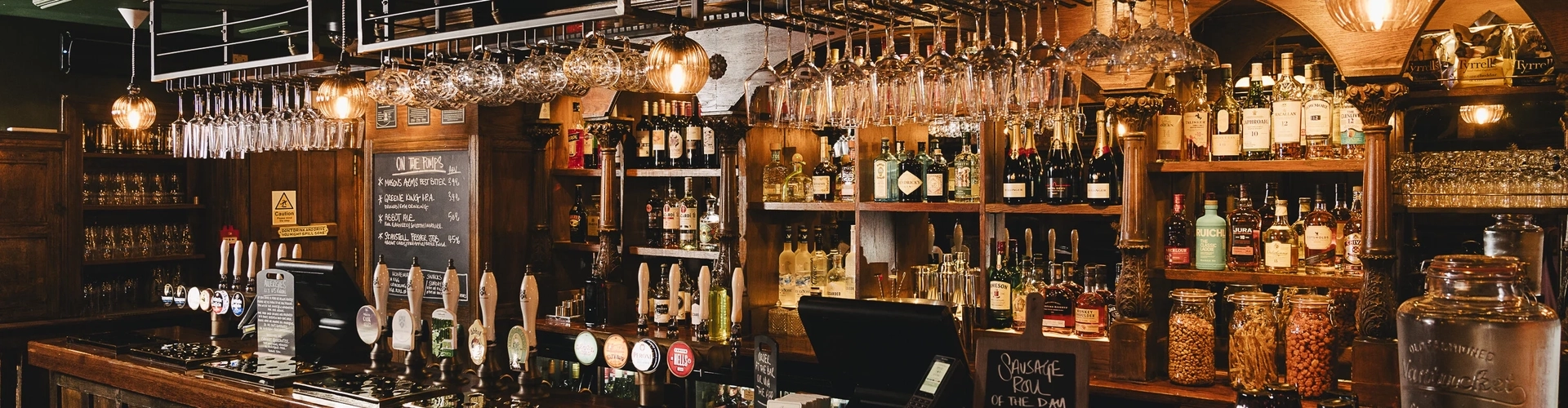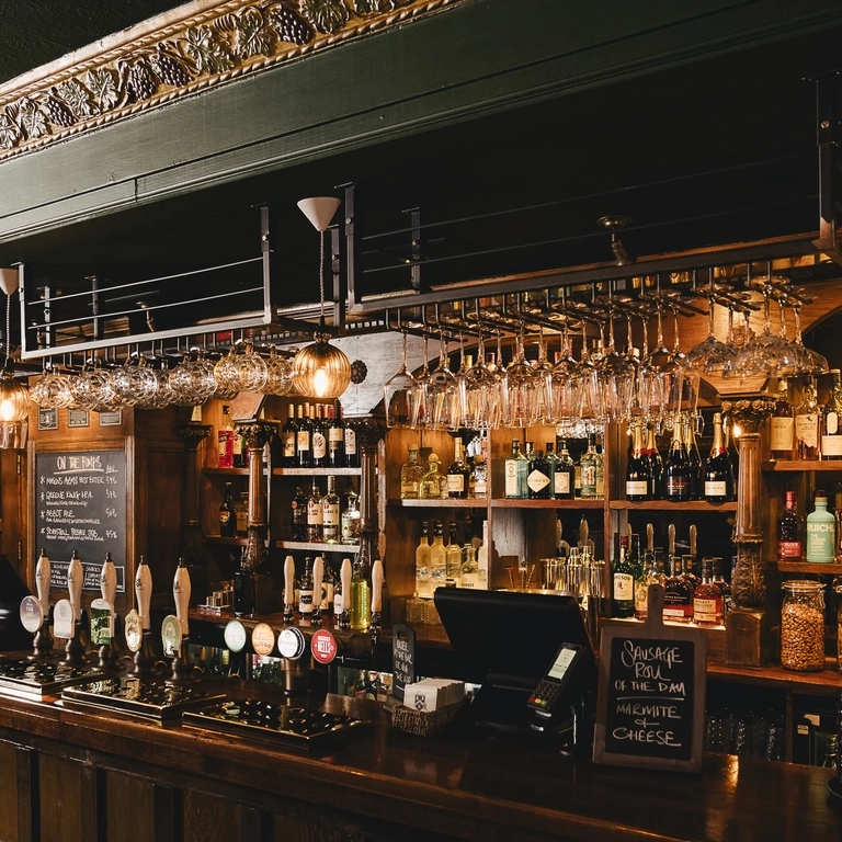 The wood panelled bar inside the Masons Arms, with glasses hanging in racks above the counter, and grape vines carved into the coving above.