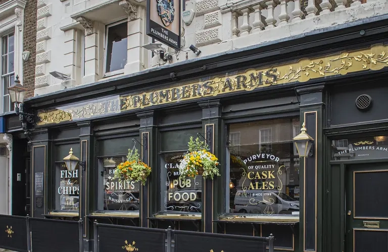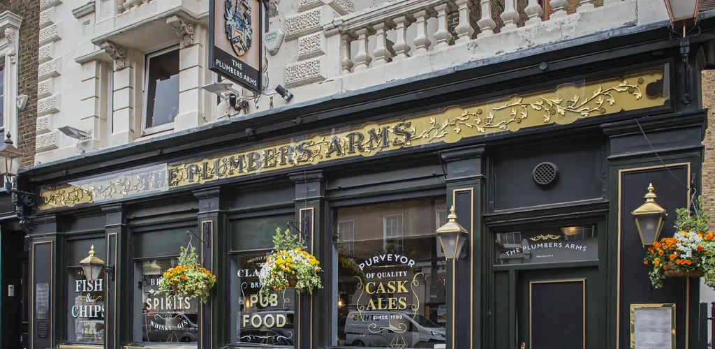 View our menuA cheerful pub close to Buckingham Palace, the Plumbers Arms is a beautiful grade II listed building in Belgravia. Built in the 1820s, The Plumbers Arms boasts dark-wood panelling, an upstairs function room with original 19th century windows and a beer garden.