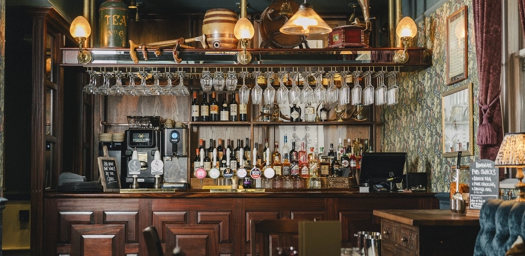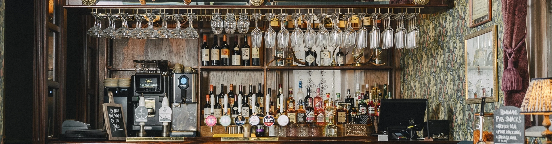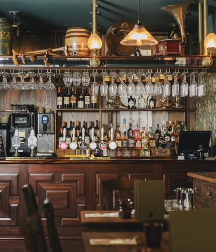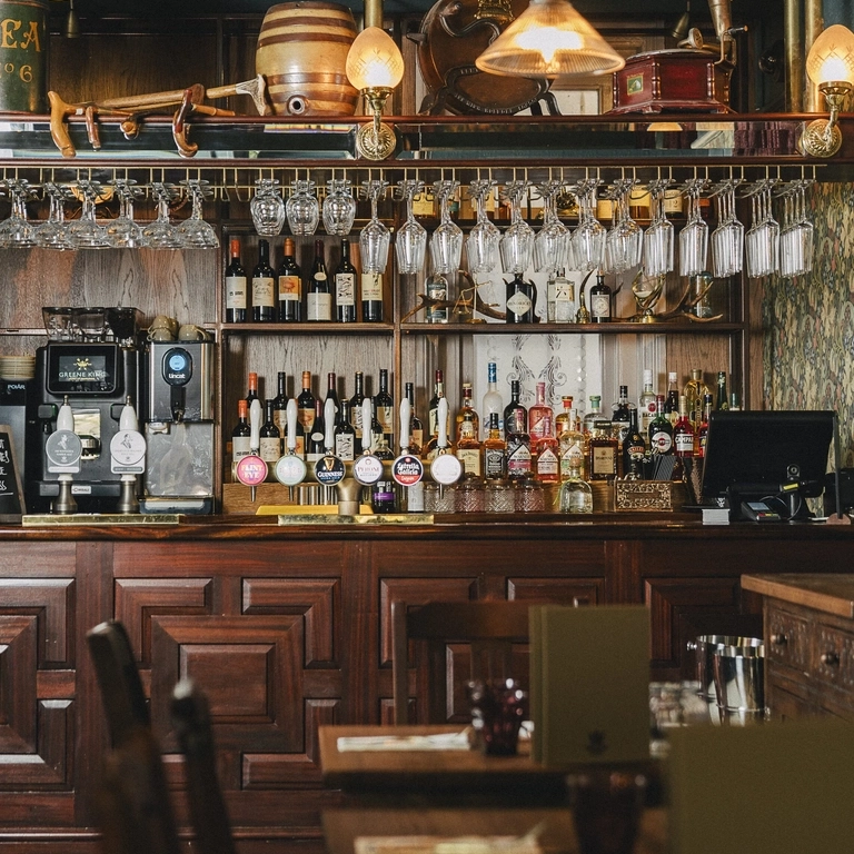 Dark wood bar with all of the branded bottles lined up neatly on the bar of the Sherlock Holmes venue in St James'