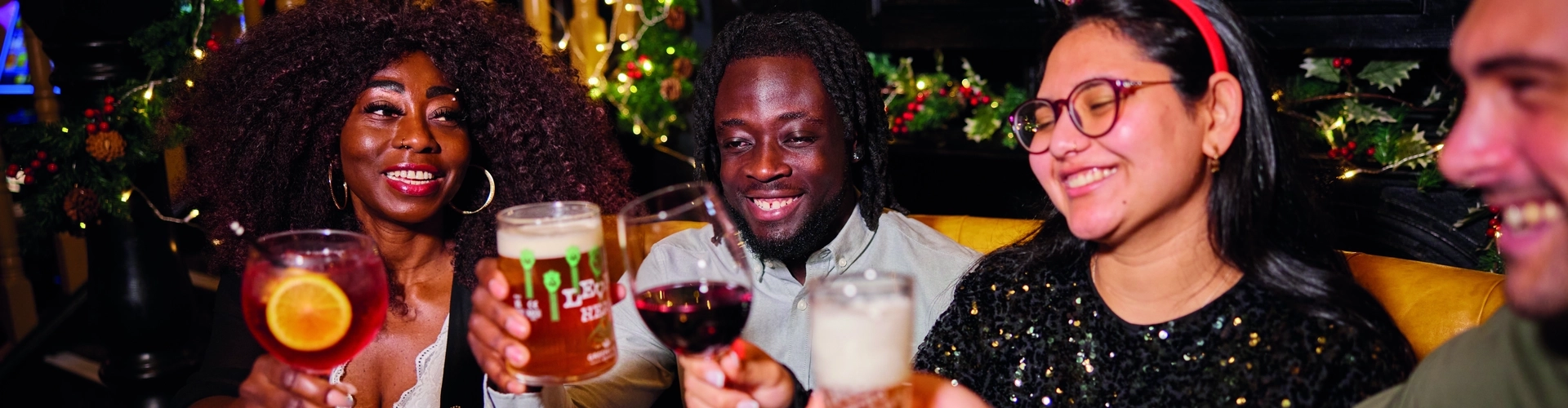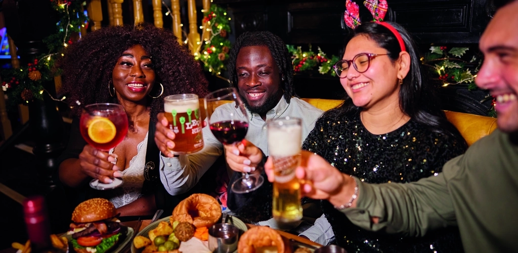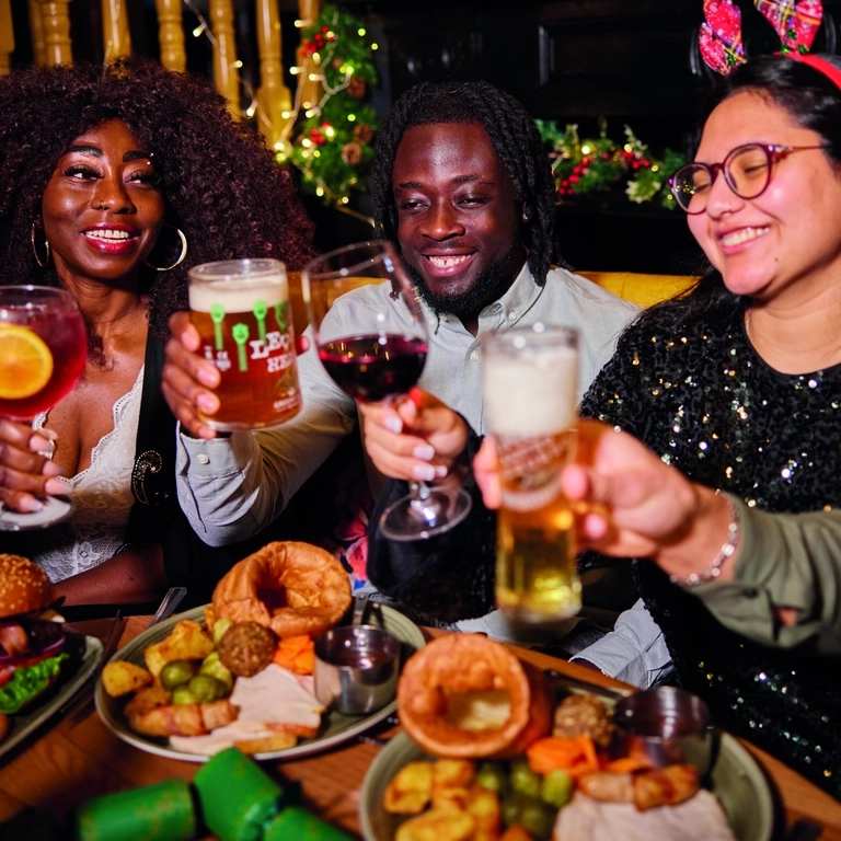 A group of people celebrating a festive Cheers while enjoying various main meals and drinks within the interior restaurant and seating area of Greene King Pub venue.