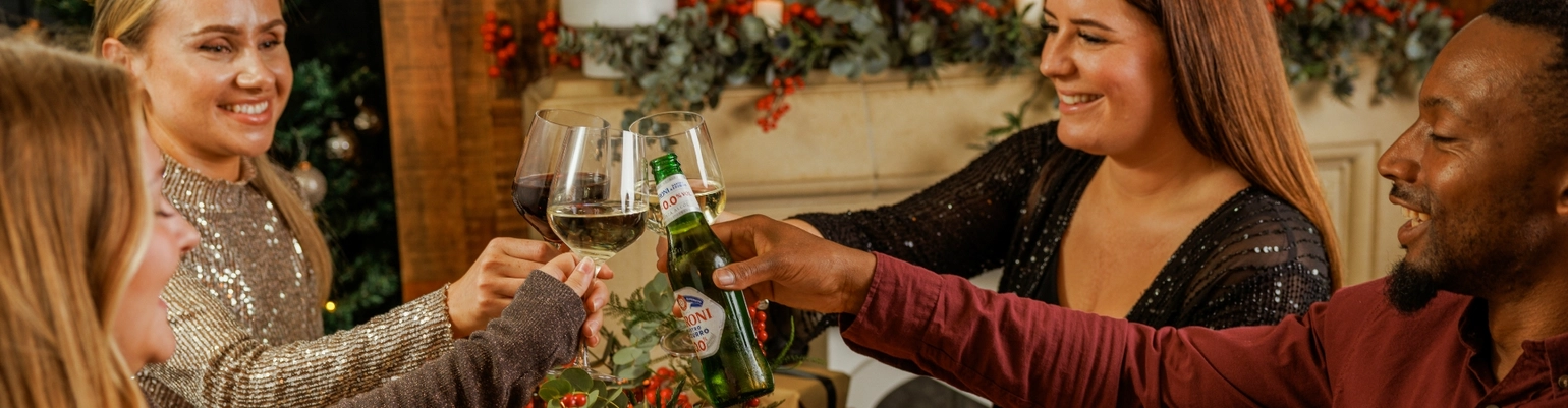 An image of 2 people holding cocktail style drinks celebrating with a festive cheers within the interior of a Greene King Pub venue.