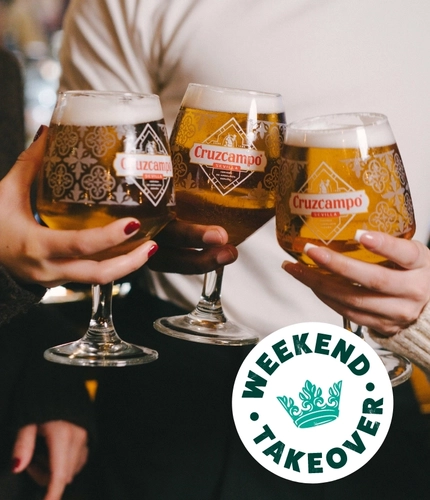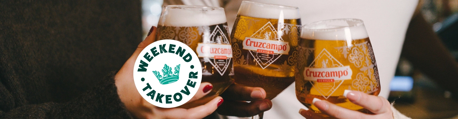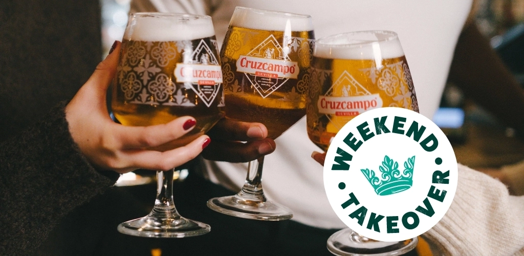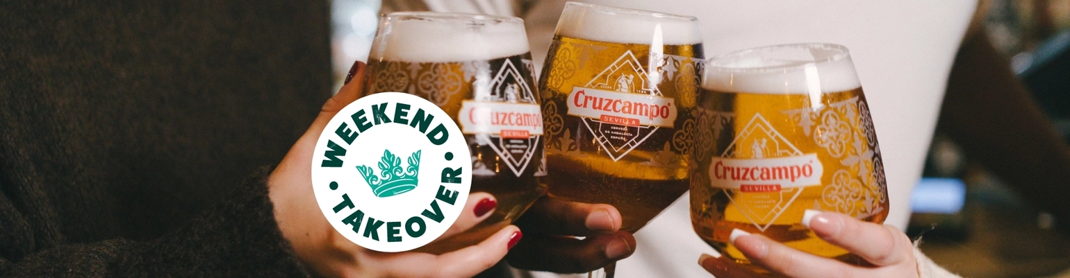 A banner of two pints of Cruzcampo in a cheers position with a 'Weekend takeover' logo for Greene King Pubs.