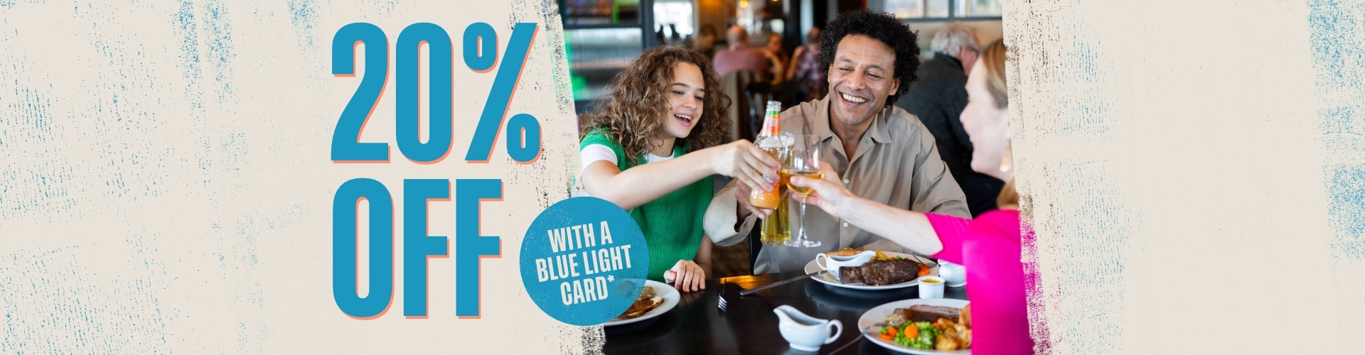 Normally, we say thanks by giving you 15% off your food bill from Monday to Sunday, but from the 16th of February until the 30th of March, we'll be upgrading your Blue Light Card discount to 20%!