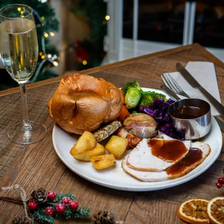 Succulent, hand-carved roast turkey served with roast potatoes, mashed potato, pig in blanket, a Yorkshire pudding, braised red cabbage, seasonal vegetables and rich gravy (1160 kcal)