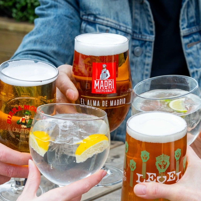 Hands holding a variety of drinks in a beer garden.
