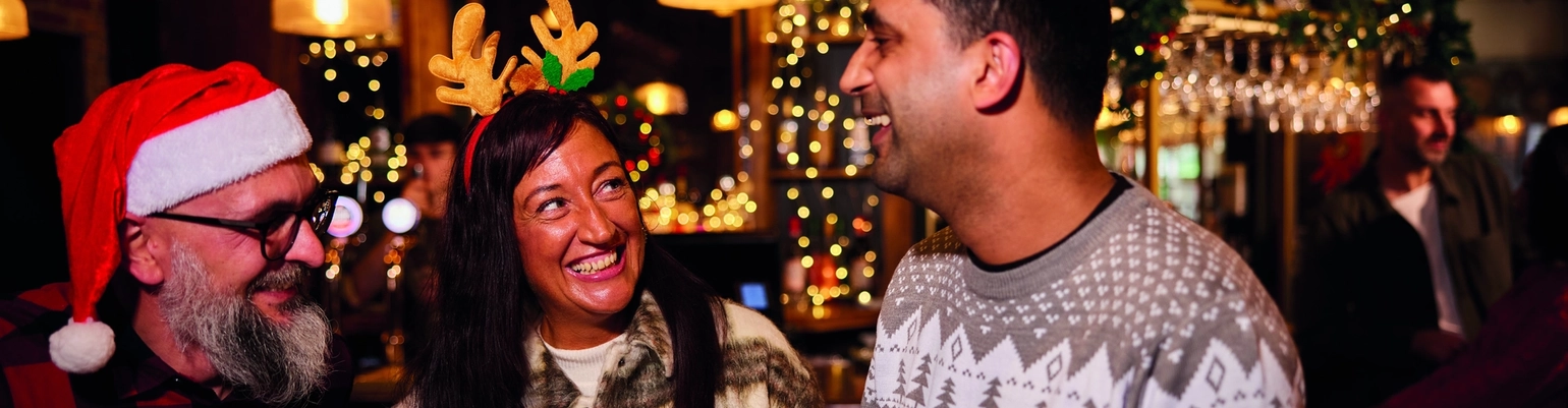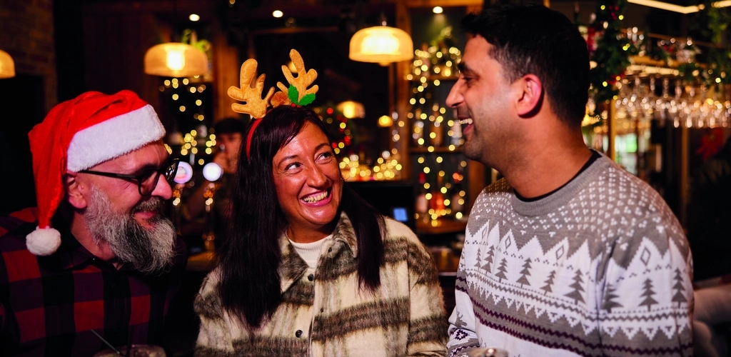 Three people are standing at a tall table with drinks,  in a festive, warmly lit bar. Two of them are wearing Christmas themed headwear.  The background features Christmas decorations, including garlands and lights, as well as hanging glasses above the bar area.