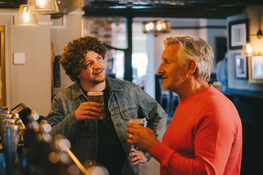 Two men are stood at a bar, holding pints of beer and enjoying conversation.