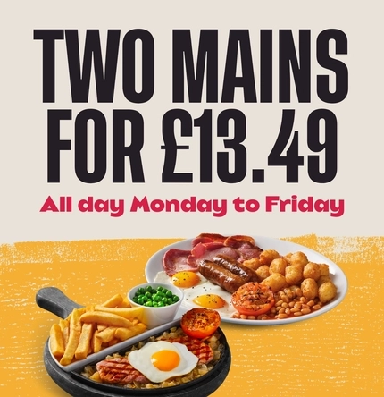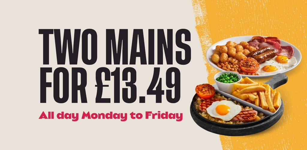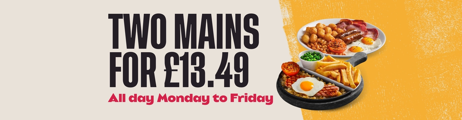 Please advise the team of any dietary requirements before ordering. Our dishes are prepared in kitchens where nuts and gluten are present as well as other allergens; we cannot guarantee that any food item is completely free from traces of allergens, due to the risk of unexpected cross contamination. We do not include ‘may contain’ information. Suitable for vegetarians. Suitable for vegans. Please note that we do not operate a dedicated vegetarian/vegan kitchen area. Our menu descriptors do not include all ingredients. Some dishes may contain alcohol which is not listed on the menu. †Fish, poultry and shellfish dishes may contain bones and/or shell. ▲Scampi may contain one or more tail per piece. *All stated weights are approximate before cooking. Metric equivalent 16oz = 1lb = 454g. ‡Sizzling skillet dishes come without fried onions when served on a plate. ^Onion rings are made from chopped and reformed onions. Full nutrition information is available on our website. Calorie counts are correct at time of print. 2 Mains for £12.49 - Available all day Monday to Friday on Can’t Beat The Classics dishes, excluding Jamaican Chicken Stew. BOGOF Burgers - Buy one get one free is available all day Thursday; on all burgers excluding Signature Burgers. Steak Deal - Available all day Monday to Wednesday; 8oz* Rump for £8.49, 8oz* Sirloin for £10.49. Sunday dishes are available all day Sunday. Alcohol for over 18s only - proof of ID may be requested. Products & offers are subject to availability at the price point advertised. Deal discounts will be applied to the cheapest qualifying items in your order. All prices are in GBP and are inclusive of VAT. Should the VAT rate change, menu pricing will be adjusted accordingly. Photography is for guidance only. We reserve the right to remove any of our food deals on all UK Bank Holidays, Christmas Eve & New Year’s Eve. Please ask a member of the team before placing your order on these days if you have any queries. ®Maltesers is a registered trademark and Mars Bar®, Trademark of Mars® Incorporated and its affiliates. Biscoff® is a registered trademark. For every Biscoff Cheesecake or Apple Pie sold, 20p plus VAT will be paid to Macmillan Cancer Support** a registered charity in England & Wales (261017), in Scotland (SC039907) and in the Isle of Man (604). Also operating in Northern Ireland. **Paid to Macmillan Cancer Support Trading Limited a wholly owned subsidiary of Macmillan Cancer Support to which it gives all of its taxable profits. Manager’s decision is final. Promoter: Greene King Brewing and Retailing Ltd, Sunrise House, Ninth Avenue, Burton upon Trent, Staffordshire, DE14 3JZ.