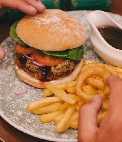 Quorn™ burger topped with sticky stuffing and cranberry BBQ sauce. Served with chips, onion rings (R) and a jug of gravy