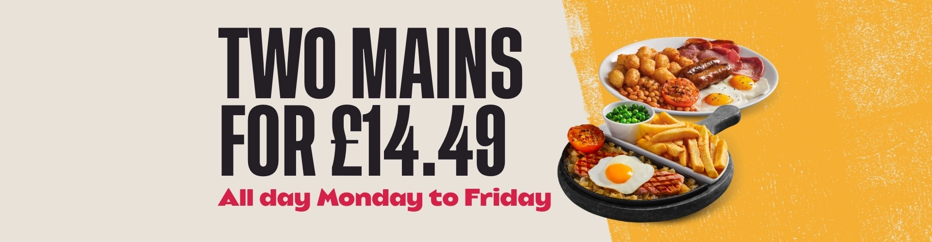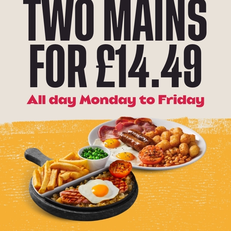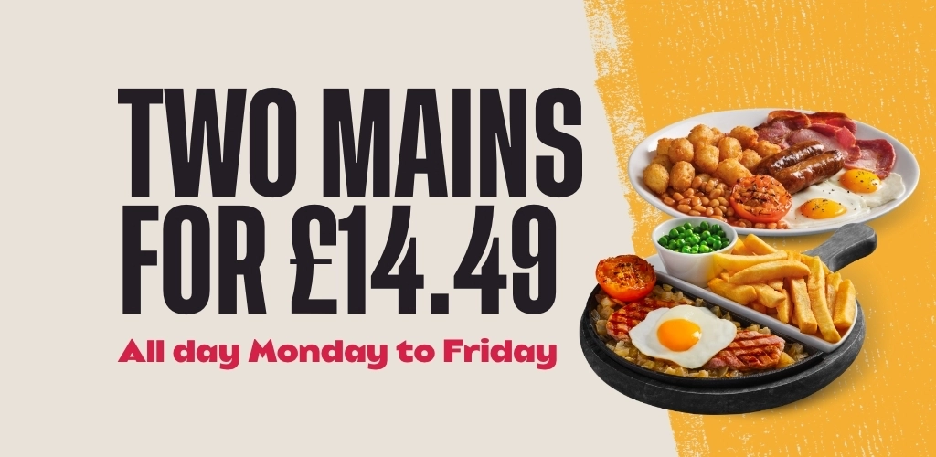 Please advise the team of any dietary requirements before ordering. Our dishes are prepared in kitchens where nuts and gluten are present as well as other allergens; we cannot guarantee that any food item is completely free from traces of allergens, due to the risk of unexpected cross contamination. We do not include ‘may contain’ information. (V) Suitable for vegetarians. (Ve) Suitable for vegans. Please note that we do not operate a dedicated vegetarian/vegan kitchen area. Our menu descriptors do not include all ingredients. Some dishes may contain alcohol which is not listed on the menu. †Fish, poultry and shellfish dishes may contain bones and/or shell. ▲Scampi may contain one or more tail per piece. *All stated weights are approximate before cooking. Metric equivalent 16oz = 1lb = 454g. ‡Sizzling skillet dishes come without fried onions when served on a plate. ^Onion rings are made from chopped and reformed onions. UNDER 6OO Dishes contain 600 calories or less. Full nutrition information is available on our website. Calorie counts are correct at time of print. 2 Mains for £13.99 - Available all day Monday to Friday on Can’t Beat The Classics dishes, excluding Jamaican Chicken Stew. BOGOF Burgers - Buy one get one free is available all day Thursday; on all burgers excluding Signature Burgers. Steak Deal - Available all day Monday to Wednesday; 8oz* Rump for £8.49, 8oz* Sirloin for £10.49. Sunday dishes are available all day Sunday. Alcohol for over 18s only - proof of ID may be requested. Products & offers are subject to availability at the price point advertised. Deal discounts will be applied to the cheapest qualifying items in your order. All prices are in GBP and are inclusive of VAT. Should the VAT rate change, menu pricing will be adjusted accordingly. Photography is for guidance only. We reserve the right to remove any of our food deals on all UK Bank Holidays, Christmas Eve & New Year’s Eve. Please ask a member of the team before placing your order on these days if you have any queries. Cadbury is a registered trademark of Mondeléz International. ®Maltesers is a registered trademark and Mars Bar®, Trademark of Mars® Incorporated and its affiliates. Lotus and Biscoff® are each registered trademarks owned by Lotus Bakeries. For every Lotus® Biscoff Cheesecake or Apple Pie sold 20p plus VAT will be paid to Macmillan Cancer Support** a registered charity in England & Wales (261017), in Scotland (SC039907) and in the Isle of Man (604). Also operating in Northern Ireland. **Paid to Macmillan Cancer Support Trading Limited a wholly owned subsidiary of Macmillan Cancer Support to which it gives all of its taxable profits. Manager’s decision is final. Promoter: Greene King Brewing and Retailing Ltd, Sunrise House, Ninth Avenue, Burton upon Trent, Staffordshire, DE14 3JZ.