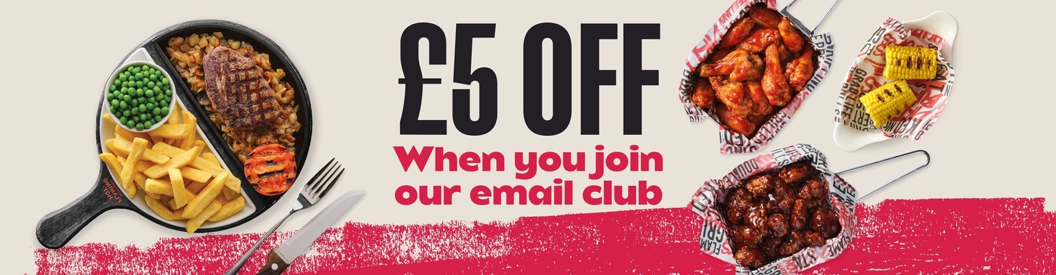 A graphic promoting £5 off when you join the email club at Flaming Grill.